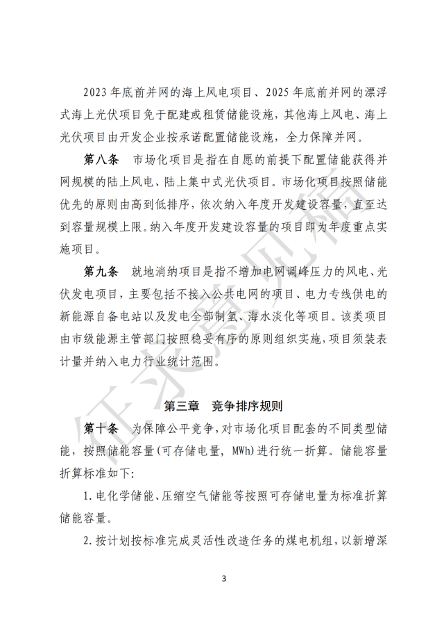 3)2023 年底前并網(wǎng)的海上風(fēng)電項目、2025 年底前并網(wǎng)的漂浮式海上光伏項目免于配建或租賃儲能設(shè)施,其他海上風(fēng)電、海上 光伏項目由開發(fā)企業(yè)按承諾配置儲能設(shè)施,全力保障并網(wǎng)。