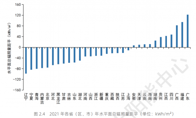 全國年水平面總輻照量距平分布有地區(qū)性差異,總體來看,北方地區(qū)較常年偏低,南方地區(qū)較常年偏高。各省與往年平均水平相比的差距如下圖所示。
