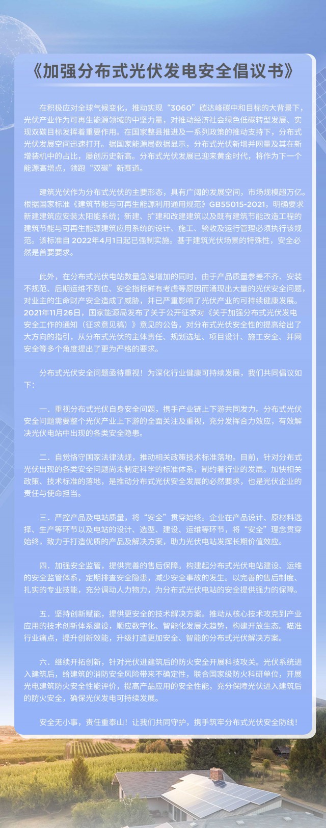 前不久,昱能科技聯(lián)合中國建筑科學研究院防火研究所、華為數(shù)字能源、優(yōu)得運維、固德威、史陶比爾、杭州龍焱、武漢日新等8家單位,共同發(fā)起了行業(yè)首個關(guān)于分布式光伏發(fā)電安全倡議及發(fā)布了《加強分布式光伏發(fā)電安全倡議書》,號召行業(yè)聚焦光伏安全問題。從《倡議書》內(nèi)容看,除了強調(diào)遵守相關(guān)法律法規(guī),重視安全問題以外,還需要光伏企業(yè)在產(chǎn)品設(shè)計、原材料選擇、生產(chǎn)等環(huán)節(jié)以及電站的設(shè)計、選型、建設(shè)、運維等環(huán)節(jié),將“安全”理念貫穿始終,致力于打造優(yōu)質(zhì)的產(chǎn)品及解決方案。