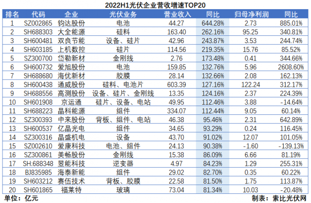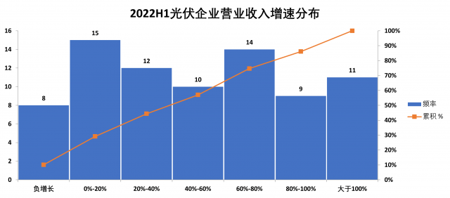 2022年上半年,79家光伏企業(yè)合計創(chuàng)收5571億元,平均增速(“平均”指“中位數(shù)”,下同)達到48%。令人欣喜的是,營收負增長的企業(yè)占比僅為10%,而營收增速超過40%的企業(yè)占比則高達71%。其中,除了硅料企業(yè)繼續(xù)保持高速增長以外,眾多“跨界者”也乘著光伏行業(yè)的“東風(fēng)”,迎來暴發(fā)式增長。