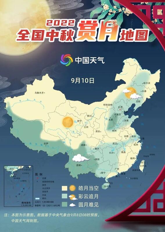 佳節(jié)來臨之際,中國天氣網(wǎng)發(fā)布2022全國賞月地圖。今年中秋節(jié)當天(9月10日),西北地區(qū)和東南沿海賞月天氣條件較好,新疆、青海、甘肅、寧夏、陜西等地都將皓月當空。(來源:中國天氣網(wǎng))