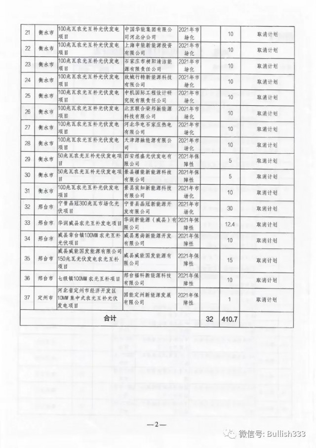 根據(jù)文件來看,相比此前發(fā)布的《風(fēng)電、光伏發(fā)電項(xiàng)目擬調(diào)整情況公示》來看,光伏新增取消三個2021年光伏保障性項(xiàng)目指標(biāo),規(guī)??傆嫗?50MW,風(fēng)電則未發(fā)生變化。需要注意的是,三個光伏項(xiàng)目均為農(nóng)光互補(bǔ)類項(xiàng)目,其業(yè)主分別為惠尚新能源開發(fā)、威縣威能國發(fā)能源以及中國電建。