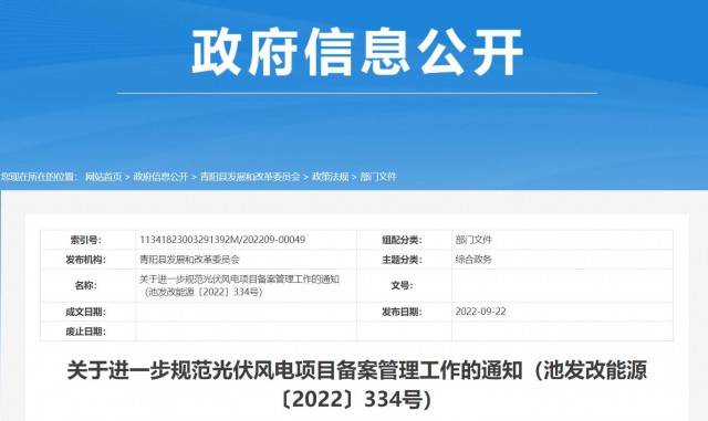 9月22日,安徽青陽(yáng)縣發(fā)改委官網(wǎng)公布《關(guān)于進(jìn)一步規(guī)范光伏風(fēng)電項(xiàng)目備案管理工作的通知》。