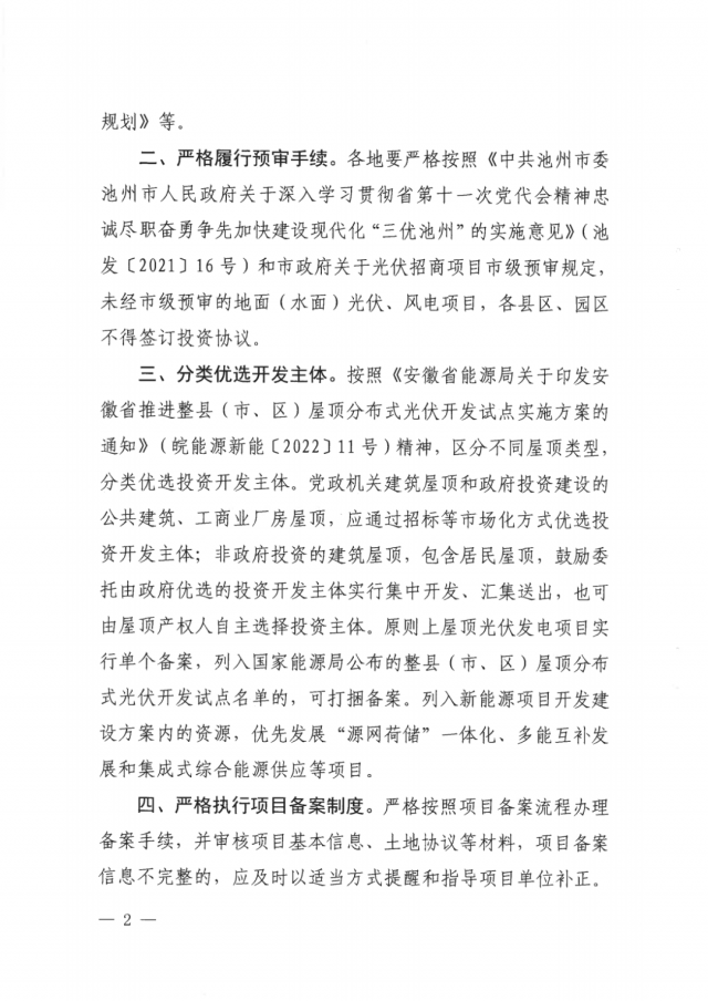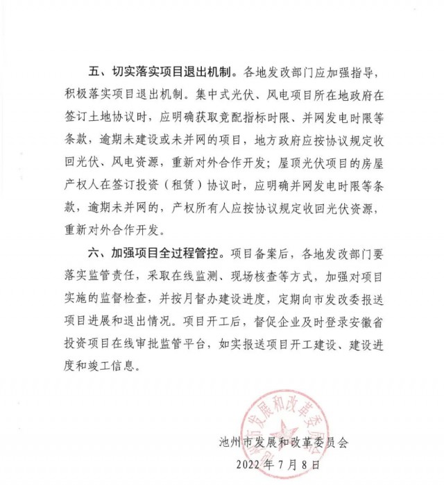 通知強(qiáng)調(diào):各地要嚴(yán)格按照《中共池州市委池州市人民政府關(guān)于深入學(xué)習(xí)貫徹省第十一次黨代會(huì)精神忠誠(chéng)盡職奮勇爭(zhēng)先加快建設(shè)現(xiàn)代化“三優(yōu)池州”的實(shí)施意見(jiàn)》(池發(fā)(2021] 16號(hào))和市政府關(guān)于光伏招商項(xiàng)目市級(jí)預(yù)審規(guī)定,未經(jīng)市級(jí)預(yù)審的地面(水面)光伏、風(fēng)電項(xiàng)目,各縣區(qū)、園區(qū)不得簽訂投資協(xié)議。