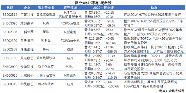 隨著“跨界潮”的愈演愈烈,A股市場中也有越來越多的企業(yè)有望復(fù)制上機(jī)數(shù)控、雙良節(jié)能的發(fā)展軌跡。在索比光伏網(wǎng)整理的“跨界”概念股名單中,多數(shù)企業(yè)的業(yè)績基數(shù)均較低,部分企業(yè)甚至還出現(xiàn)了一定程度的虧損。