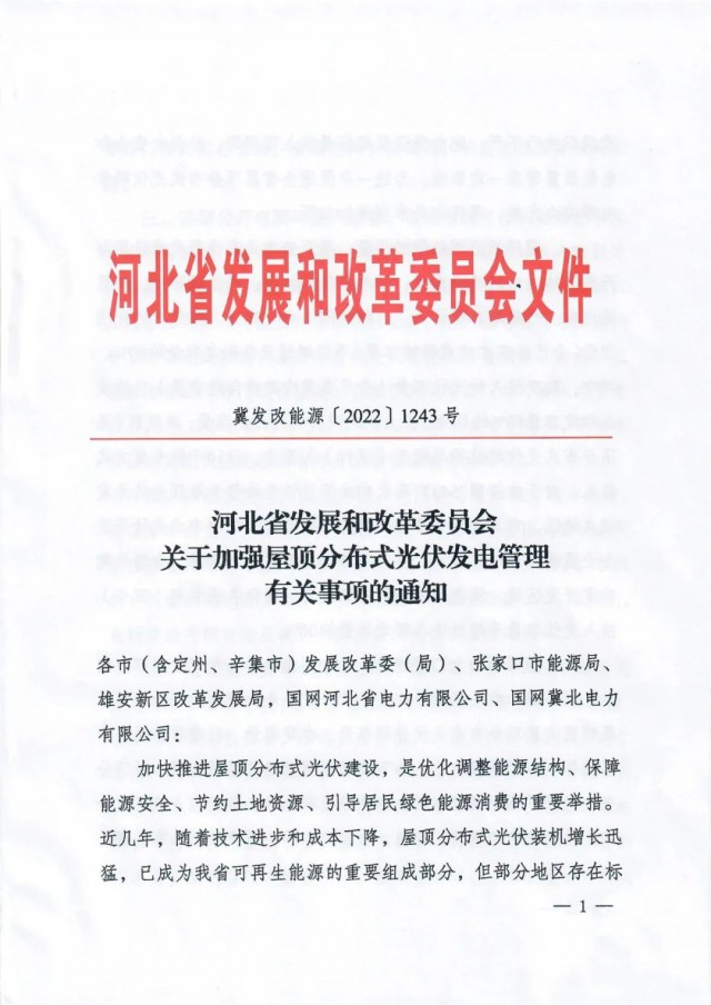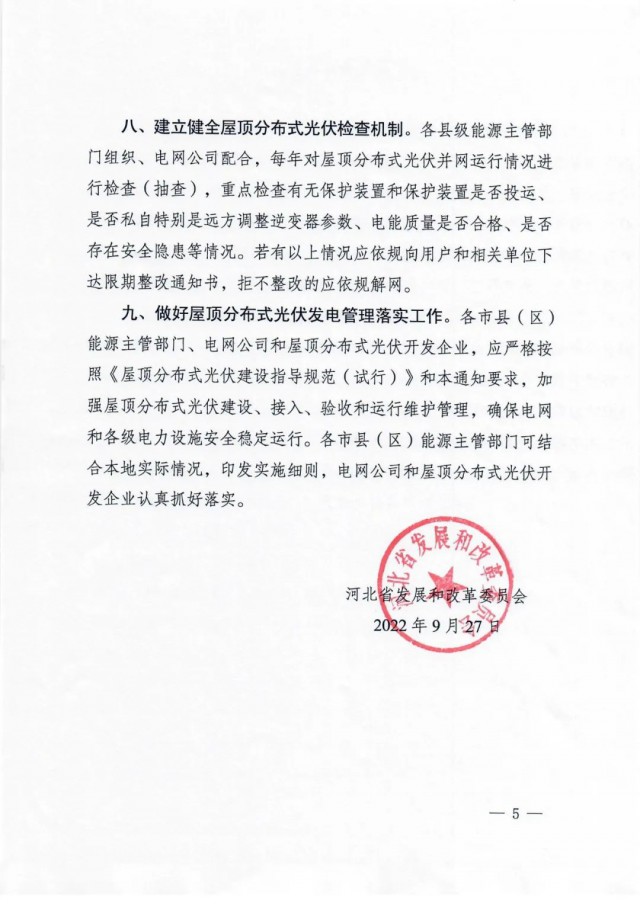 9月27日,河北省發(fā)改委發(fā)布《關(guān)于加強屋頂分布式光伏發(fā)電管理有關(guān)事項的通知》,通知指出,部分地區(qū)存在標準規(guī)范執(zhí)行不嚴、配電變壓器超容量接入等問題,給供電安全和電能質(zhì)量帶來一定影響。為進一步促進全省屋頂分布式光伏科學有序安全發(fā)展,通知提出: