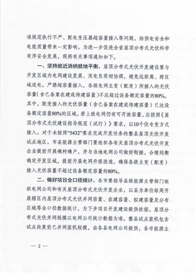 對于未按照“5432”要求完成開發(fā)任務(wù)的整縣屋頂光伏開發(fā)試點地區(qū),市縣能源主管部門要組織各有關(guān)屋頂分布式光伏開發(fā) 企業(yè)提前開展確村確戶,并與當?shù)仉娋W(wǎng)公司做好銜接,合理均衡確定開發(fā)區(qū)域,提前開展電網(wǎng)升級改造,確保各級主變(配變)接入光伏容量不超過設(shè)備額定容量的80%。
