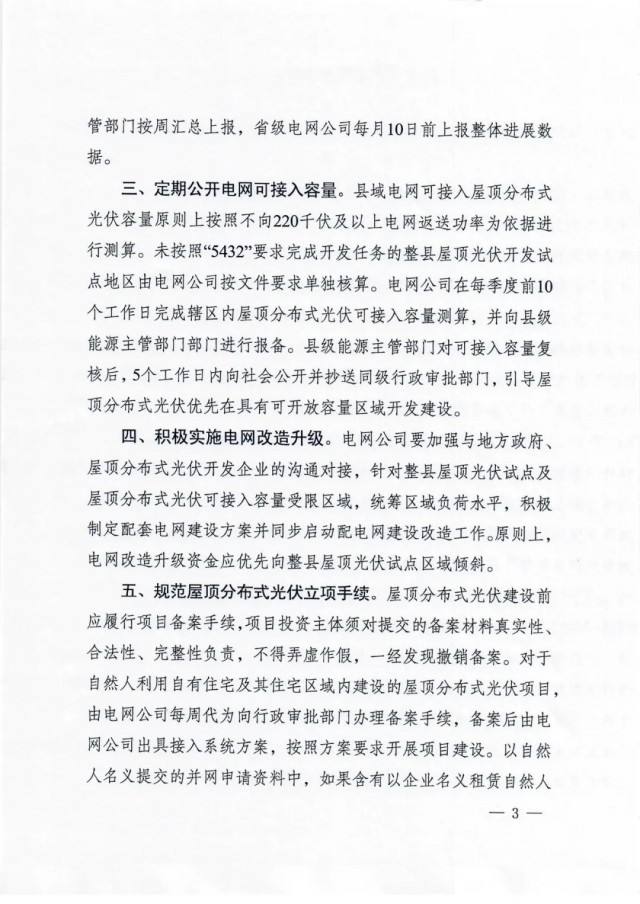 定期公開電網(wǎng)可接入容量??h域電網(wǎng)可接入屋頂分布式 光伏容量原則上按照不向220千伏及以上電網(wǎng)返送功率為依據(jù)進行測算。未按照“5432”要求完成開發(fā)任務(wù)的整縣屋頂光伏開發(fā)試點地區(qū)由電網(wǎng)公司按文件要求單獨核算。