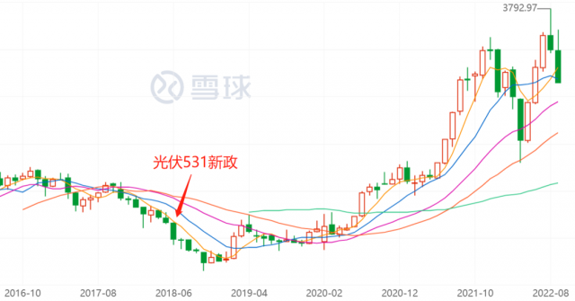 光伏產(chǎn)業(yè)的強(qiáng)勢并非從一而終,最近一次市場記憶猶新的渡劫是,由于發(fā)電成本總是居高不下,在產(chǎn)業(yè)補(bǔ)貼退坡(531新政)后,市場一度對光伏產(chǎn)業(yè)的未來充滿疑慮,上市公司的整體估值跌至歷史低點(diǎn)。