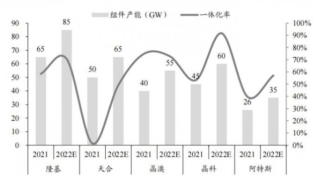 圖:組件龍頭組件產(chǎn)能及一體化率對比(GW,%),來源:CPIA,東吳證券研究所