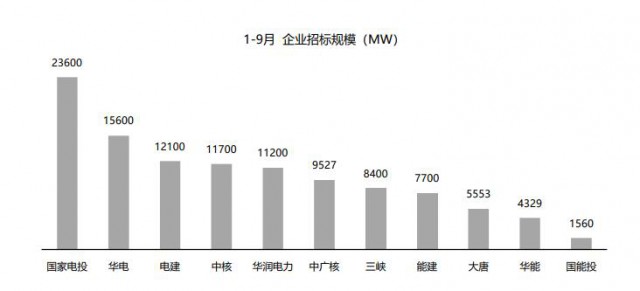 ?圖:據(jù)公開數(shù)據(jù)統(tǒng)計,2022年1-9月企業(yè)招標規(guī)模(MW)