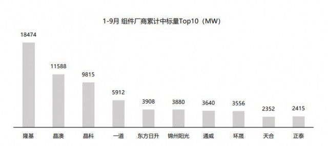 ?圖:據(jù)公開數(shù)據(jù)統(tǒng)計,2022年1-9月組件廠商累計中標量(MW)