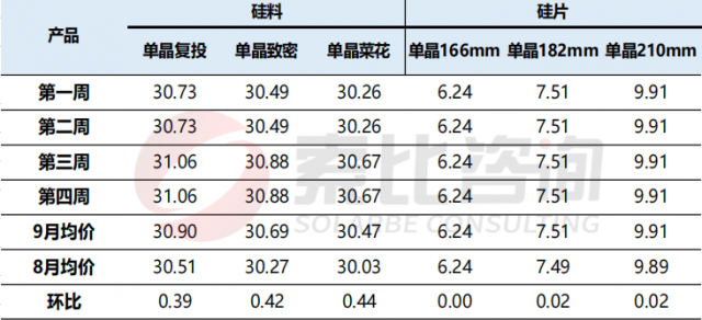 根據(jù)索比咨詢對(duì)多家電池片制造商的調(diào)研:就9月硅片價(jià)格行情來(lái)看,單晶166mm均價(jià)6.24元/片,較9月環(huán)比持平;單晶182mm均價(jià)漲至7.51元/片,較8月環(huán)比上漲0.27%;單晶210mm均價(jià)漲至9.91元/W,較8月環(huán)比上升0.20%。