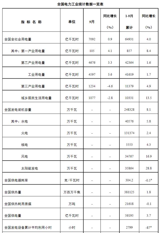 10月24日,國家能源局發(fā)布1-9月份全國電力工業(yè)統(tǒng)計數(shù)據(jù)。
