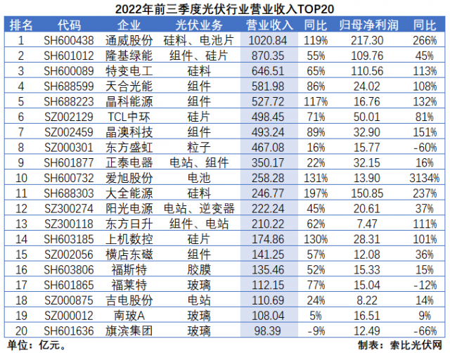 從營收規(guī)模來看,硅料和組件依然是創(chuàng)收能力最強(qiáng)的環(huán)節(jié)。而且,多數(shù)企業(yè)前三季度營業(yè)收入均已超過2021年全年,且創(chuàng)歷史新高。其中,通威股份營收規(guī)模首次突破千億大關(guān),達(dá)到1021億元;隆基綠能二、三季度邊際改善顯著,環(huán)比增速分別達(dá)到71%和15%,營收規(guī)模達(dá)到870.35億元;特變電工受益于硅料、煤炭產(chǎn)品的“量價齊升”,達(dá)到646.51億元。