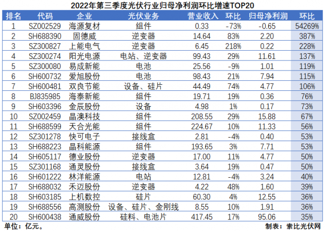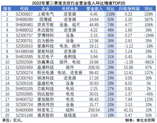 從環(huán)比增速來看,逆變器環(huán)節(jié)受益于歐洲戶用儲能市場的全面爆發(fā),第三季度經(jīng)營業(yè)績持續(xù)攀升。其中,上能電氣營收和歸母凈利潤環(huán)比增速高達(dá)218%和228%;固德威達(dá)到83%和387%;陽光電源為29%和137%。