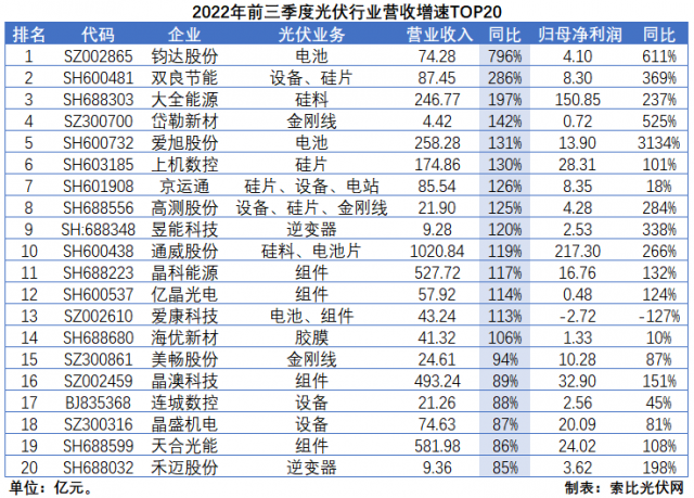 2022年前三季度,在整個A股市場一片“哀嚎”之際,光伏行業(yè)依然延續(xù)高速增長態(tài)勢。根據(jù)索比光伏網(wǎng)的統(tǒng)計數(shù)據(jù)顯示,80家光伏概念股營收增速和歸母凈利潤增速中值分別達(dá)到51%和40%;營業(yè)收入和歸母凈利潤呈增長態(tài)勢的企業(yè)分別達(dá)到71家和57家,占比高達(dá)89%和71%。