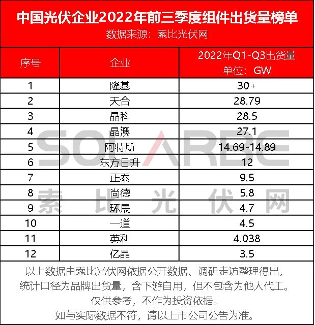 經(jīng)過索比光伏網(wǎng)多次調(diào)研走訪,結(jié)合相關(guān)企業(yè)財報、投資者活動記錄、招投標信息等,我們整理了中國光伏企業(yè)2022年前三季度組件出貨量榜單,詳情如下: