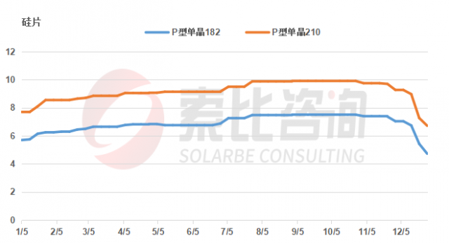 根據(jù)索比咨詢了解到的價(jià)格數(shù)據(jù),182mm硅片從年初的5.70元/片,逐步上漲到7.51元/片,210mm硅片也從年初的7.70元/片漲到9.91元/片,部分訂單價(jià)格超過10元/片,12月則出現(xiàn)驟降,到月底時(shí)182mm硅片已降至4.73元/片,210mm硅片降至6.72元/片。整體看,硅片環(huán)節(jié)降價(jià)往往早于其他環(huán)節(jié),特別是硅片龍頭企業(yè),會通過調(diào)整開工率等方式,倒逼硅料環(huán)節(jié)降價(jià)。
