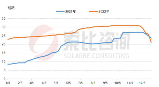 據(jù)索比咨詢統(tǒng)計(jì),2022年的前11個(gè)月,多晶硅一直延續(xù)之前的上漲態(tài)勢。以單晶致密料為例,從年初的22.91萬元/噸開始不斷上漲,最高達(dá)到30.88萬元/噸,且保持較長時(shí)間(9月-11月),直到11月底出現(xiàn)試探性下跌,并在12月出現(xiàn)快速下降,目前致密料已降至20.98萬元/噸,菜花料僅18.97萬元/噸,且仍有繼續(xù)走低之勢。