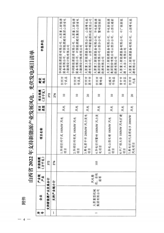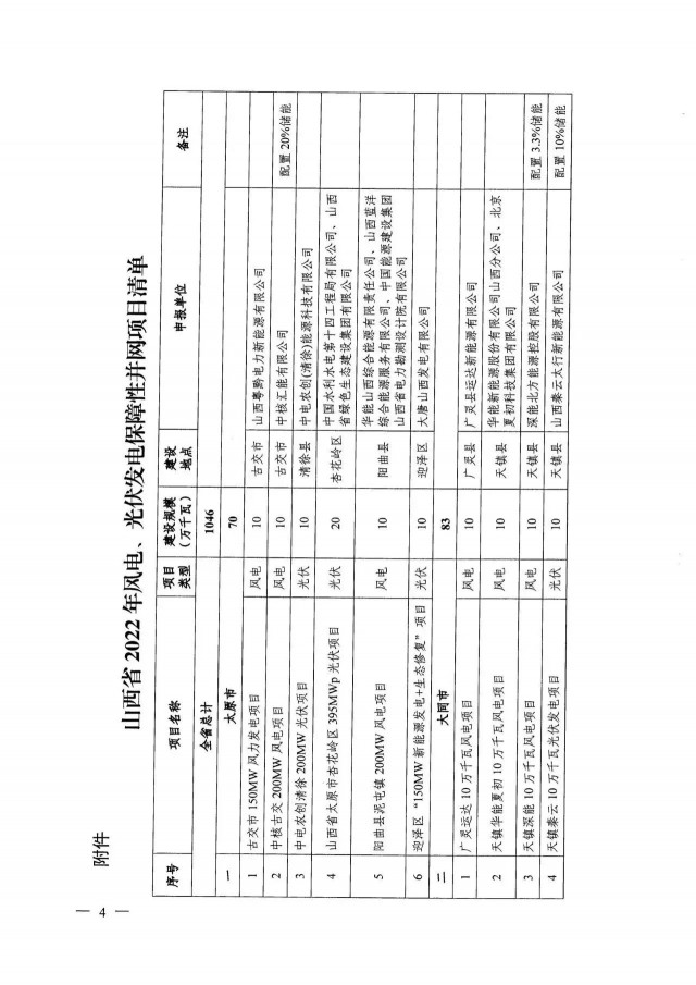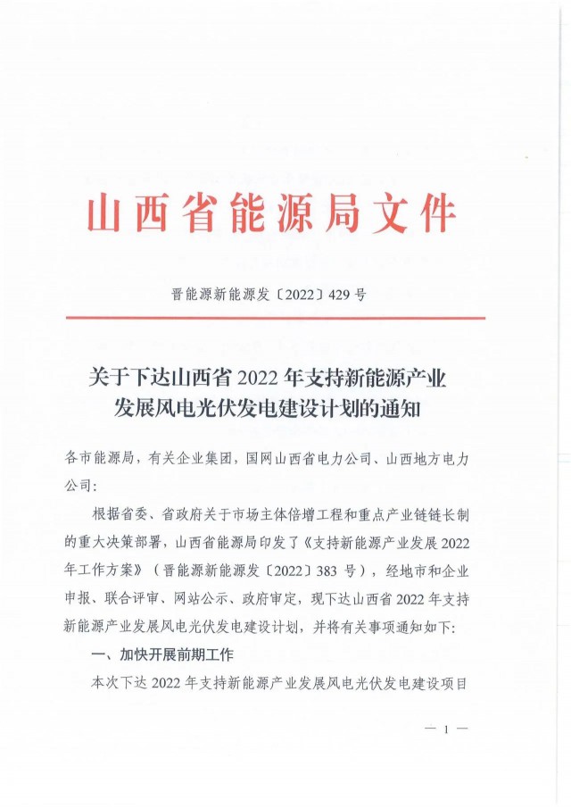 近日,山西省能源局先后印發(fā)了《關(guān)于下達山西省2022年風(fēng)電光伏發(fā)電保障性并網(wǎng)年度建設(shè)計劃的通知》(晉能源新能源發(fā)〔2022〕428號)和《關(guān)于下達山西省2022年支持新能源產(chǎn)業(yè)發(fā)展風(fēng)電光伏發(fā)電建設(shè)計劃的通知》(晉能源新能源發(fā)〔2022〕429號),共下達風(fēng)電、光伏項目132個,規(guī)模合計1418萬千瓦(14.18GW)。