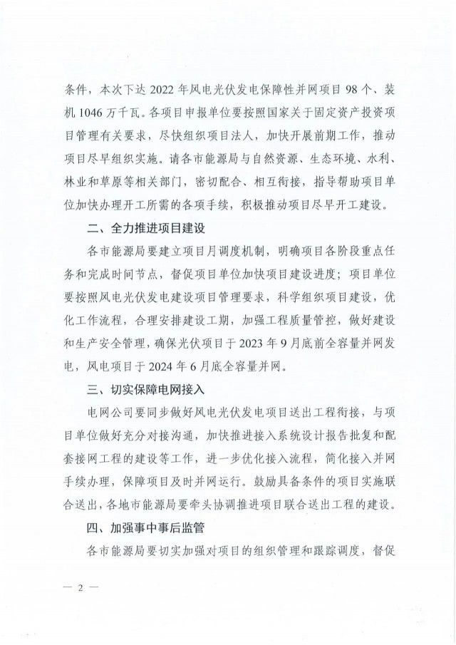 具體看,保障性并網(wǎng)項目98個,裝機1046萬千瓦(10.46GW)。其中,光伏項目68個,裝機741萬千瓦(7.41GW),風(fēng)光儲一體項目2個,裝機共25萬千瓦。要求確保光伏項目于2023年9月底前全容量并網(wǎng)發(fā)電。