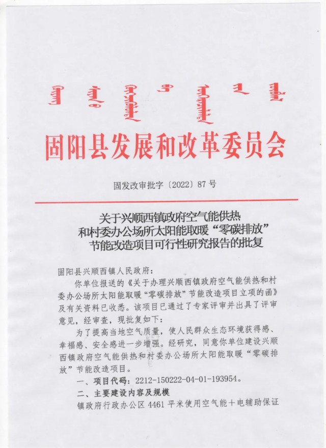 《固陽縣興順西鎮(zhèn)政府空氣能供熱和村委辦公場所太陽能取暖“零碳排放”節(jié)能改造項目批復(fù)公示》