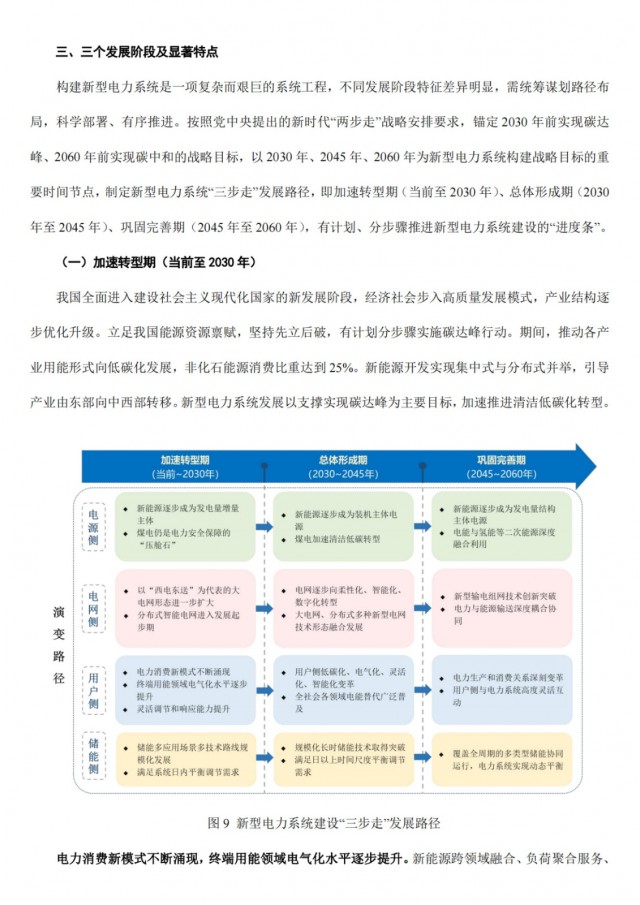 按照黨中央提出的新時代“兩步走”戰(zhàn)略安排要求,錨定2030年前實現(xiàn)碳達峰、2060年前實現(xiàn)碳中和的戰(zhàn)略目標,以2030年、2045年、2060年為新型電力系統(tǒng)構建戰(zhàn)略目標的重要時間節(jié)點,制定新型電力系統(tǒng)“三步走”發(fā)展路徑,即加速轉型期(當前至2030年)、總體形成期(2030年至2045年)、鞏固完善期(2045年至2060年),有計劃、分步驟推進新型電力系統(tǒng)建設的“進度條”。