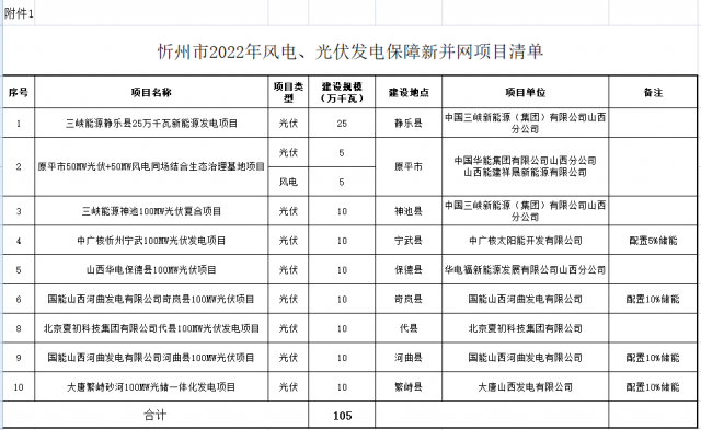 通知指出:2022年度山西省能源局共下達忻州市風電、光伏發(fā)電項目共27個326萬千瓦,其中下達2022年度保障性并網(wǎng)項目9個105萬千瓦,下達支持新能源產(chǎn)業(yè)發(fā)展風電、光伏發(fā)電建設項目18個221萬千瓦。