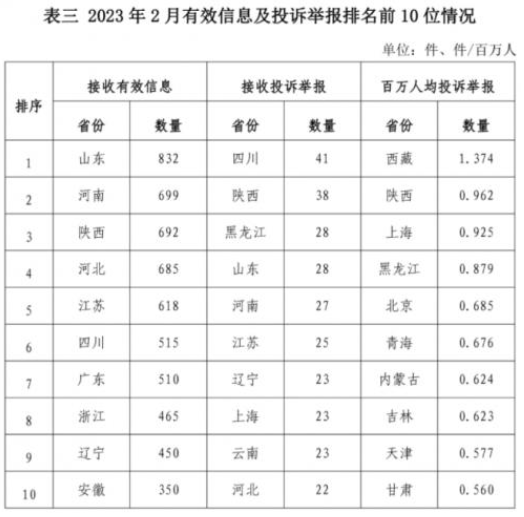 三、分布情況各?。ㄗ灾螀^(qū)、直轄市)按照接收的有效信息數(shù)量排序,山東、河南、陜西、河北、江蘇、四川、廣東、浙江、遼寧、安徽排在全國前10位;按照接收的投訴舉報數(shù)量排序,四川、陜西、黑龍江、山東、河南、江蘇、遼寧、上海、云南、河北排在全國前10位;按照百萬人均投訴舉報數(shù)量排序,西藏、陜西、上海、黑龍江、北京、青海、內(nèi)蒙古、吉林、天津、甘肅排在全國前10位。(2023年2月有效信息及投訴舉報排名前10位情況見表三)