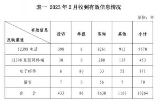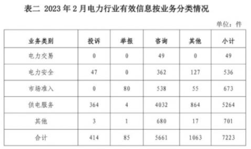 3月16日,國家能源局通報了“12398能源監(jiān)管熱線”的投訴、舉報、咨詢情況。2023年2月,共收到有效信息10264件,其中:
