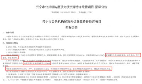 以興寧市招標(biāo)公告為例,招標(biāo)公告顯示,興寧市公共機構(gòu)屋頂光伏資源特許經(jīng)營范圍為利用公共機構(gòu)屋頂布設(shè)屋頂光伏,規(guī)模為75.274MW,項目的總投資為66833萬元,其中:建設(shè)投資32513萬元,特許經(jīng)營權(quán)價格32000萬元,建設(shè)期貸款利息2299萬元,鋪底流動資金21萬元。按照這一數(shù)據(jù)折算,興寧市整縣光伏單瓦投資成本為8.88元/瓦,對應(yīng)的特許權(quán)經(jīng)營費為4.25元/瓦。