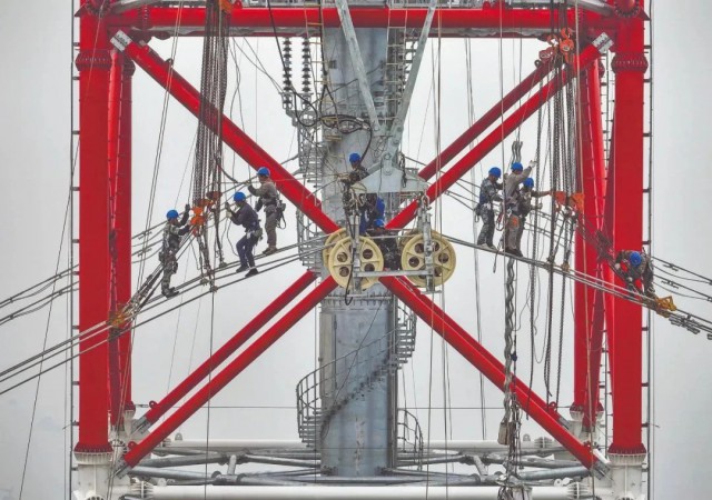 近日,國內(nèi)規(guī)模最大的超高壓跨越長江輸變電工程——泰州鳳城至無錫梅里500千伏輸變電工程正式建成投運,圖為作業(yè)人員進(jìn)行高空導(dǎo)線施放作業(yè)