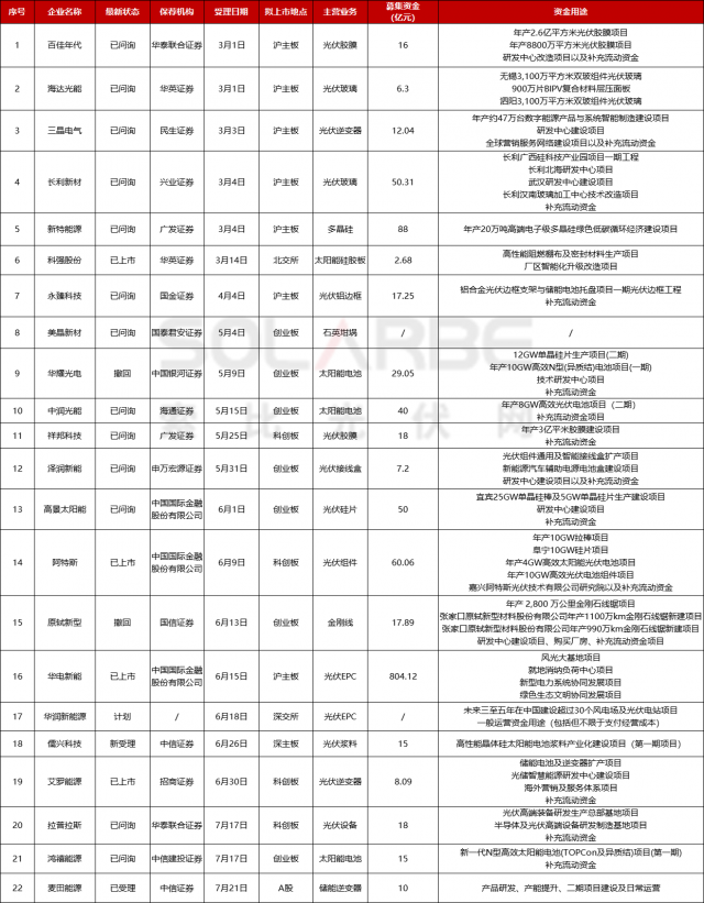 索比光伏網(wǎng)據(jù)公開(kāi)數(shù)據(jù)統(tǒng)計(jì),今年以來(lái)IPO獲得受理的光伏公司共有22家,包括3家太陽(yáng)能電池企業(yè),光伏膠膜、光伏玻璃、逆變器、EPC企業(yè)各2家,還有多晶硅、光伏漿料、石英坩堝、接線(xiàn)盒等環(huán)節(jié)企業(yè),擬募資額合計(jì)超1285億元,其中華電新能以804.12億元的募資額創(chuàng)下目前A股新能源領(lǐng)域的最大規(guī)模IPO記錄。