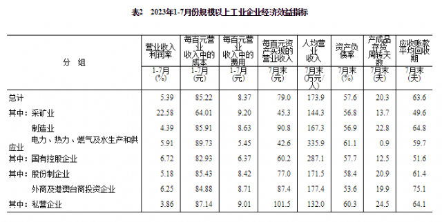 7月末,規(guī)模以上工業(yè)企業(yè)每百元資產(chǎn)實(shí)現(xiàn)的營業(yè)收入為79.0元,同比減少6.2元;人均營業(yè)收入為173.9萬元,同比增加4.9萬元;產(chǎn)成品存貨周轉(zhuǎn)天數(shù)為20.3天,同比增加1.1天;應(yīng)收賬款平均回收期為63.6天,同比增加6.3天。