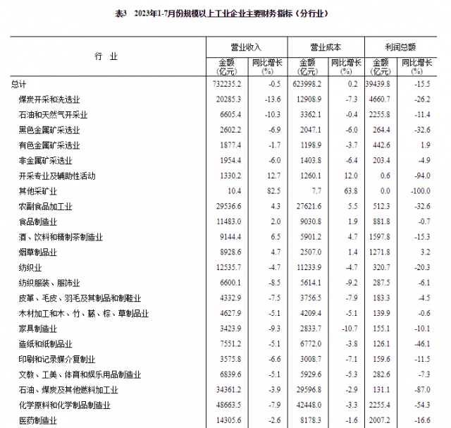 1—7月份,在41個(gè)工業(yè)大類行業(yè)中,13個(gè)行業(yè)利潤總額同比增長,28個(gè)行業(yè)下降。主要行業(yè)利潤情況如下:電力、熱力生產(chǎn)和供應(yīng)業(yè)利潤總額同比增長51.2%,電氣機(jī)械和器材制造業(yè)增長33.7%,通用設(shè)備制造業(yè)增長14.5%,專用設(shè)備制造業(yè)增長2.1%,汽車制造業(yè)增長1.0%,石油和天然氣開采業(yè)下降11.4%,紡織業(yè)下降20.3%,煤炭開采和洗選業(yè)下降26.2%,計(jì)算機(jī)、通信和其他電子設(shè)備制造業(yè)下降26.4%,非金屬礦物制品業(yè)下降28.8%,農(nóng)副食品加工業(yè)下降32.6%,有色金屬冶煉和壓延加工業(yè)下降36.7%,化學(xué)原料和化學(xué)制品制造業(yè)下降54.3%,石油、煤炭及其他燃料加工業(yè)下降87.0%,黑色金屬冶煉和壓延加工業(yè)下降90.5%。