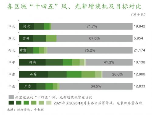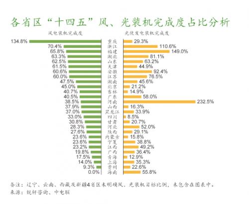 目前,河南及福建兩省已完成“十四五”新增風(fēng)、光裝機目標(biāo)。除此之外,大部分省區(qū)的光伏發(fā)電裝機完成度高于風(fēng)電。