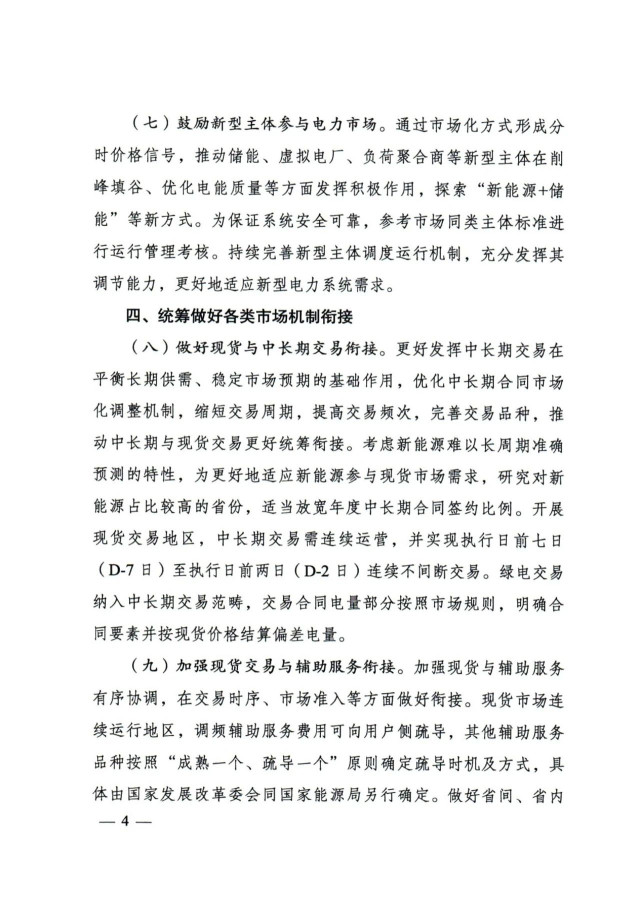 通知提出,加快放開各類電源參與電力現(xiàn)貨市場。按照2030年新能源全面參與市場交易的時(shí)間節(jié)點(diǎn),現(xiàn)貨試點(diǎn)地區(qū)結(jié)合實(shí)際制定分步實(shí)施方案。分布式新能源裝機(jī)占比較高的地區(qū),推動(dòng)分布式新能源上網(wǎng)電量參與市場,探索參與市場的有效機(jī)制。暫未參與所在地區(qū)現(xiàn)貨市場的新能源發(fā)電主體,應(yīng)視為價(jià)格接受者參與電力現(xiàn)貨市場出清,可按原有價(jià)格機(jī)制進(jìn)行結(jié)算,但須按照規(guī)則進(jìn)行信息披露,并與其他經(jīng)營主體共同按市場規(guī)則公平承擔(dān)相應(yīng)的不平衡費(fèi)用。