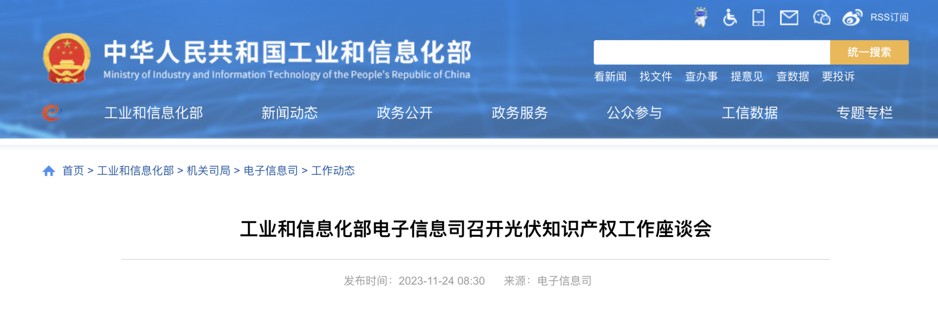 11 月 24 日,據(jù)工業(yè)和信息化部官網(wǎng)消息,近日工業(yè)和信息化部電子信息司在京召開光伏知識(shí)產(chǎn)權(quán)工作座談會(huì),就開展光伏行業(yè)知識(shí)產(chǎn)權(quán)體系建設(shè),加強(qiáng)知識(shí)產(chǎn)權(quán)保護(hù)和成果轉(zhuǎn)化,促進(jìn)光伏產(chǎn)業(yè)持續(xù)創(chuàng)新發(fā)展,組織有關(guān)單位開展工作交流,并對(duì)下一步工作進(jìn)行部署。光伏領(lǐng)域部分骨干企業(yè)、行業(yè)協(xié)會(huì)、專利機(jī)構(gòu)、研究機(jī)構(gòu)、律師事務(wù)所等有關(guān)負(fù)責(zé)人參加會(huì)議。