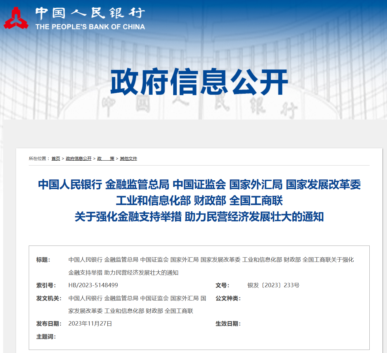 11月27日,中國人民銀行、金融監(jiān)管總局、中國證監(jiān)會、國家外匯局、國家發(fā)展改革委、工業(yè)和信息化部、財政部、全國工商聯(lián)等八部門聯(lián)合發(fā)布《關(guān)于強化金融支持舉措 助力民營經(jīng)濟發(fā)展壯大的通知》,提出支持民營經(jīng)濟的25條具體舉措。