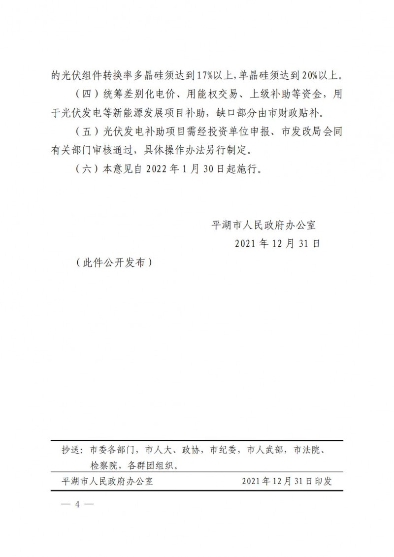 同時(shí)繼續(xù)對(duì)利用農(nóng)村獨(dú)立住宅屋頂或庭院、新農(nóng)村集中連片住房、城鎮(zhèn)高(多)層住宅小區(qū)、公寓、保障性住房、別墅排屋等民居建筑屋頂和農(nóng)村村級(jí)組織集體屋頂、城鎮(zhèn)社區(qū)公共建筑屋頂?shù)募彝ノ蓓敼夥?xiàng)目實(shí)施補(bǔ)貼,市級(jí)財(cái)政對(duì)2021年至2025年期間并網(wǎng)的家庭屋頂光伏項(xiàng)目按0.45元/千瓦時(shí)標(biāo)準(zhǔn)給予補(bǔ)貼,補(bǔ)貼時(shí)限為并網(wǎng)發(fā)電之后第二個(gè)完整抄表月起12個(gè)月。