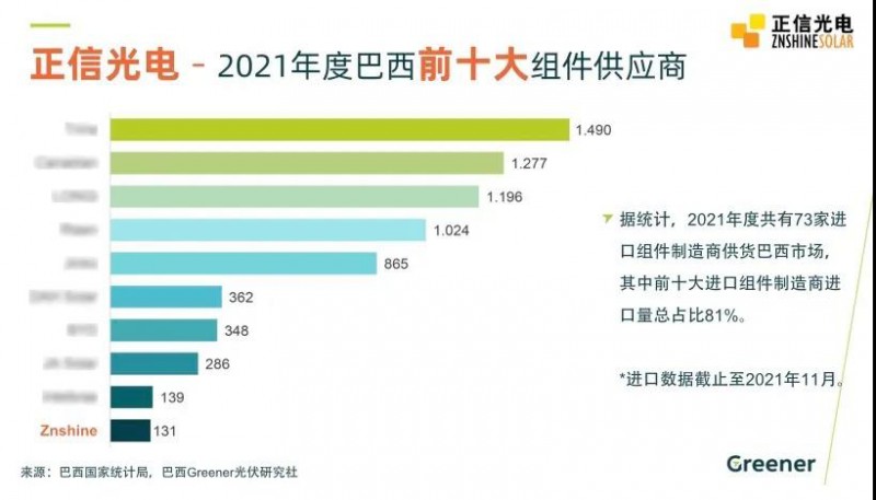 根據(jù)巴西國家統(tǒng)計(jì)局及巴西權(quán)威光伏研究社Greener的最新統(tǒng)計(jì),正信光電以堅(jiān)挺的組件出口業(yè)績(jī),再次名列2021年度巴西前十大組件供應(yīng)商。