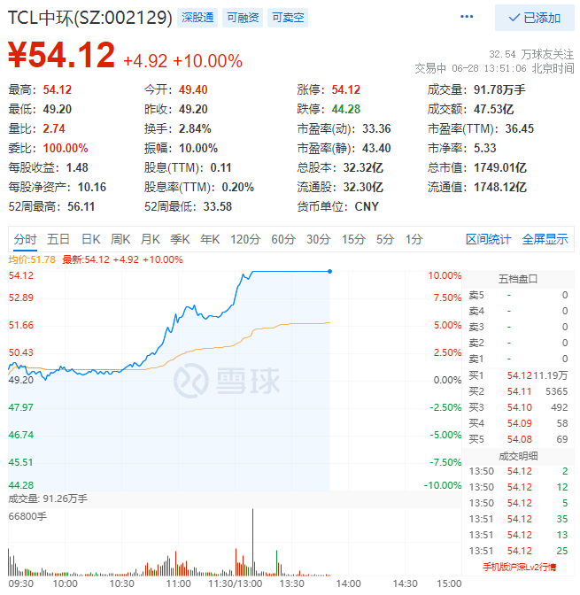 6月28日,TCL中環(huán)(SZ:002129)午后強(qiáng)勢(shì)漲停,股價(jià)報(bào)54.12元/股,總市值達(dá)到1749億元,距離歷史前高56.13元/股僅有咫尺之遙!自4月27日低點(diǎn)以來,公司股價(jià)漲幅達(dá)到61%!