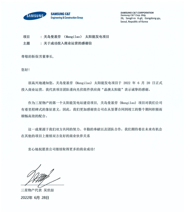 為表示對晶澳在項目建設過程中的大力支持以及對晶澳高品質(zhì)產(chǎn)品的贊賞和感謝,三星物產(chǎn)在項目建成后特寄來感謝信,以表謝意。三星物產(chǎn)在感謝信中寫道:“作為三星物產(chǎn)的第一個太陽能發(fā)電站建設項目,關島曼基勞項目對我們公司有著里程碑式的象征意義,因此,我們更加感謝貴公司在從簽署合同到竣工的整個期間積極而順暢高效的配合?!?/p>