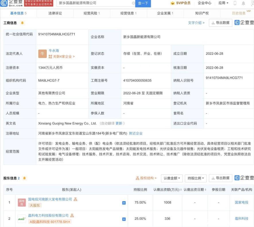 企查查股權穿透顯示,該公司由國電投河南新火發(fā)電有限公司、晶科科技共同持股。