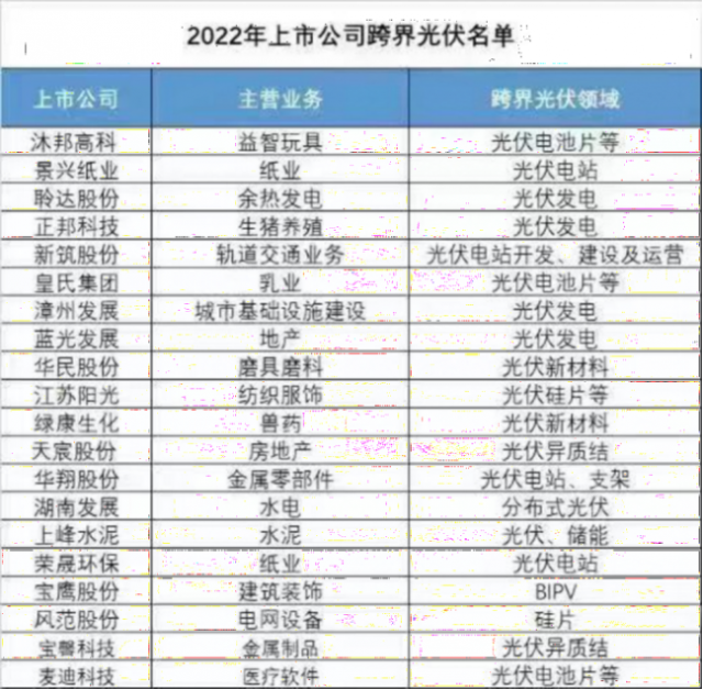 資本是“逐利”的,如此多的企業(yè)紛紛跨界光伏也是不足為怪的。根據(jù)財聯(lián)社統(tǒng)計2022年有20家上市公司跨界光伏,其涉及領(lǐng)域五花八門,有紙業(yè)、生豬養(yǎng)殖、軌道交通、獸藥、水泥、建筑裝飾、醫(yī)療軟件等等。具體如下: