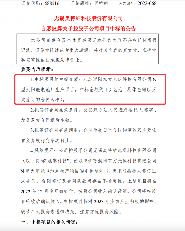 近日,奧特維公告稱,公司控股子公司無錫奧特維旭睿科技有限公司已取得江蘇潤陽東方光伏科技有限公司N型太陽能電池片生產(chǎn)項(xiàng)目的中標(biāo)通知書,上述項(xiàng)目將在2022年12月底開始交付。中標(biāo)金額約1.3億元。