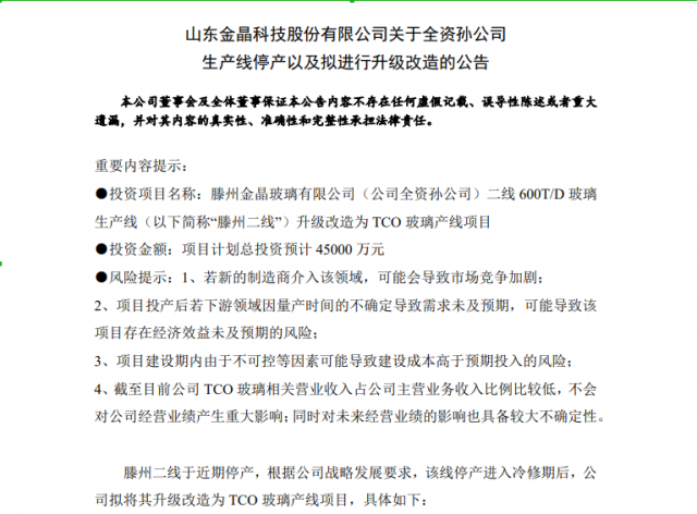 金晶科技:滕州二線停產(chǎn),擬將其升級改造為TCO玻璃產(chǎn)線項目