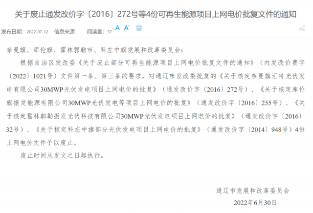 此前,太極實業(yè)(600667)8月4日晚間公告,公司關(guān)注到內(nèi)蒙古發(fā)改委官網(wǎng)刊登的《關(guān)于廢止部分可再生能源項目上網(wǎng)電價批復(fù)文件的通知》,涉及子公司五個集中式光伏電站;所涉電站將不再享受電費補貼,公司將對所涉電站評估后計提固定資產(chǎn)減值準備,初步測算固定資產(chǎn)減值金額為3.28億元左右。該項固定資產(chǎn)減值預(yù)計將減少公司2022年上半年凈利潤3.28億元左右,占最近一期經(jīng)審計凈利潤的36.12%。同時,本次電價批復(fù)廢止將導(dǎo)致所涉電站電價補貼被取消,經(jīng)初步測算,預(yù)計減少公司2022年下半年光伏發(fā)電業(yè)務(wù)收入4906萬元左右,減少公司2022年下半年凈利潤4170萬元左右。