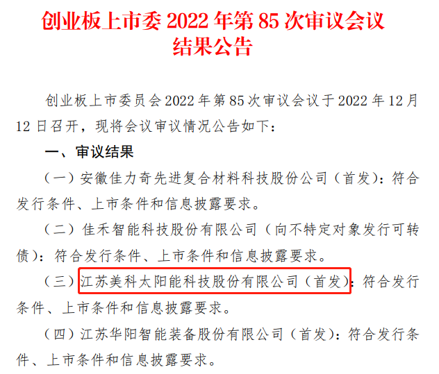 12月12日,深圳證券交易所創(chuàng)業(yè)板上市委員會發(fā)布公告稱,江蘇美科太陽能科技股份有限公司的首次公開發(fā)行股票申請符合發(fā)行條件、上市條件和信息披露要求。